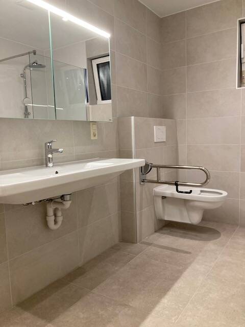 Hieronder werd een seniorendouche voorzien van een antislip doucheplaat die gelijk met de vloer werd geplaatst, wat zorgt voor een drempelloze en veilige instap.